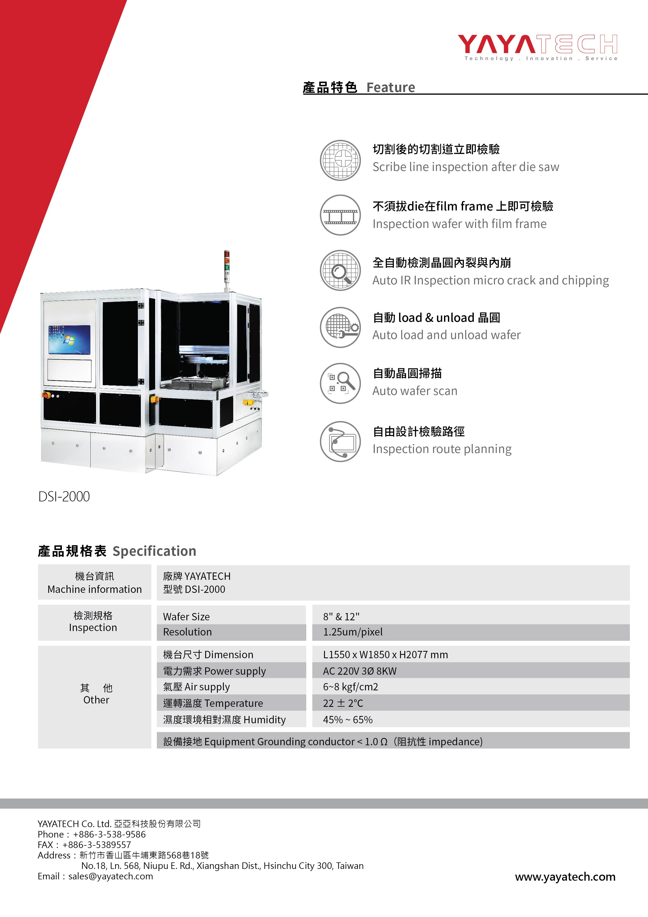 針對半導體晶圓切割(die saw)後造成的(de)背崩和(hé)隱崩等缺陷做(zuò)檢測,全自(zì)動的(de)晶圓紅外(wài)線≥檢查機可(kě)自(zì)動的(de)檢測出異常缺陷,降低(dī)了(le)人(rén)為判斷的(de)不(bù)確定性與時效性,且不(bù)須挑die(pick &↔ place)即可(kě)檢測,提升產品品質的(de)管控,也(yě)提供wafer mapping,缺陷影(yǐng)像輸出及統計資訊...等功能(néng)。